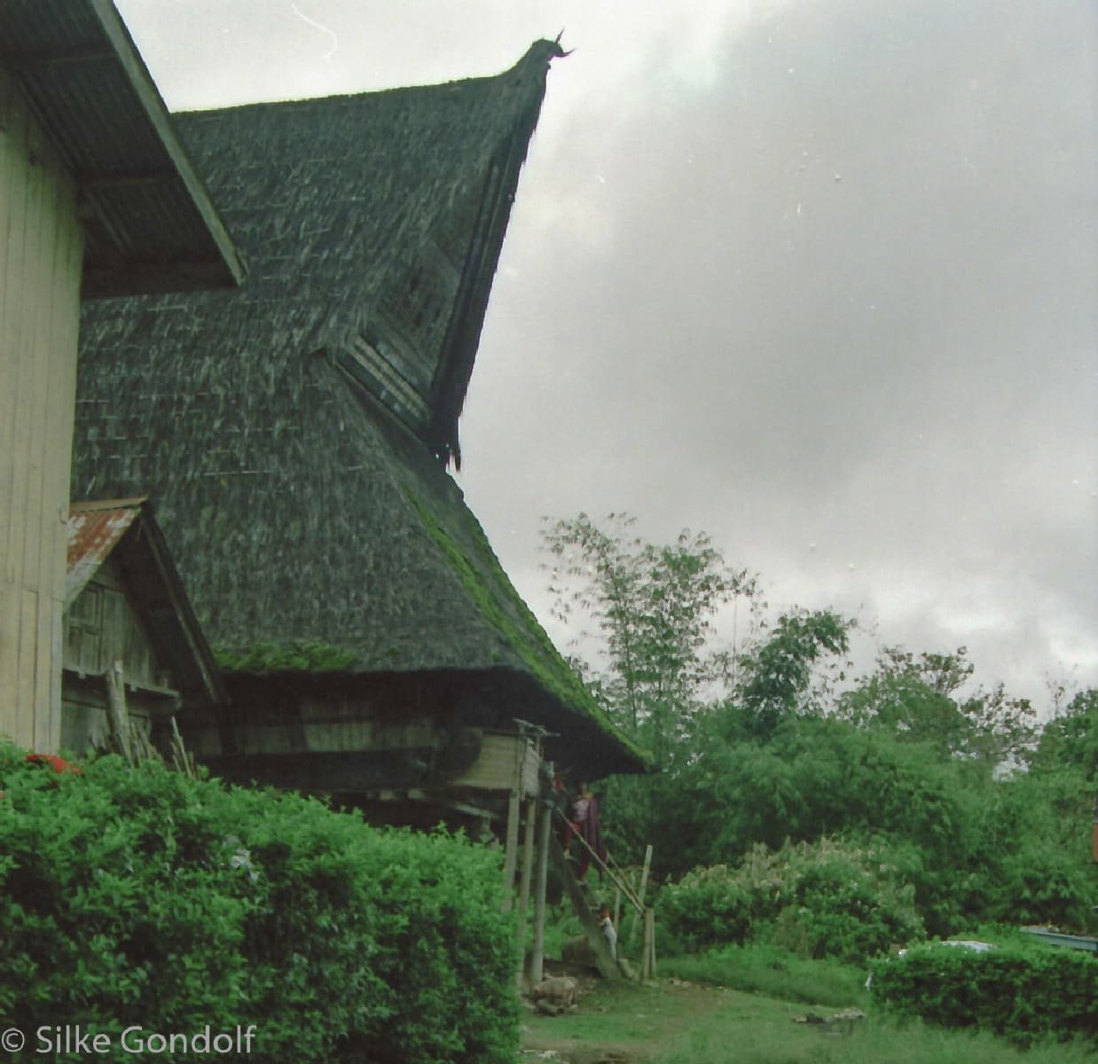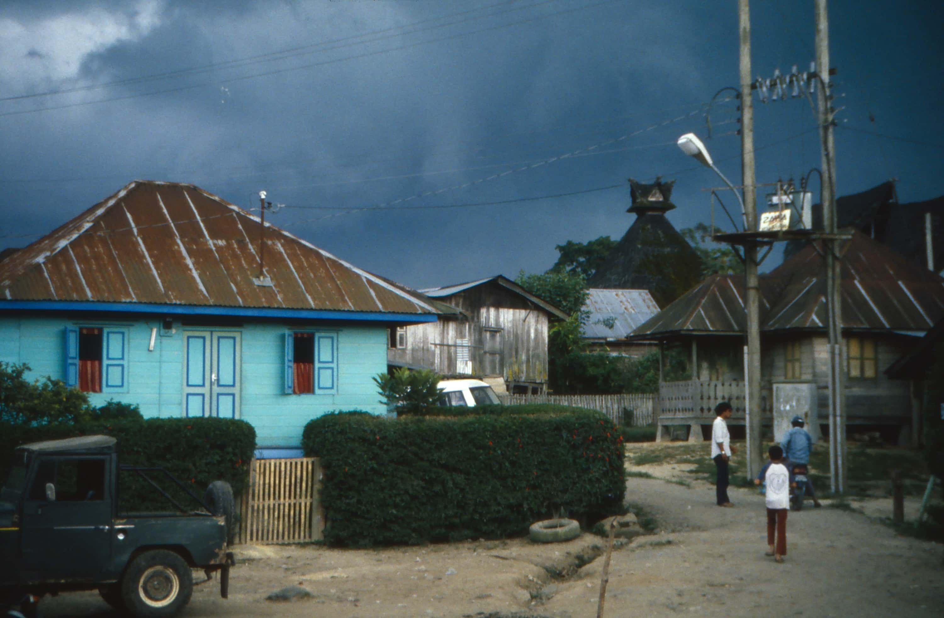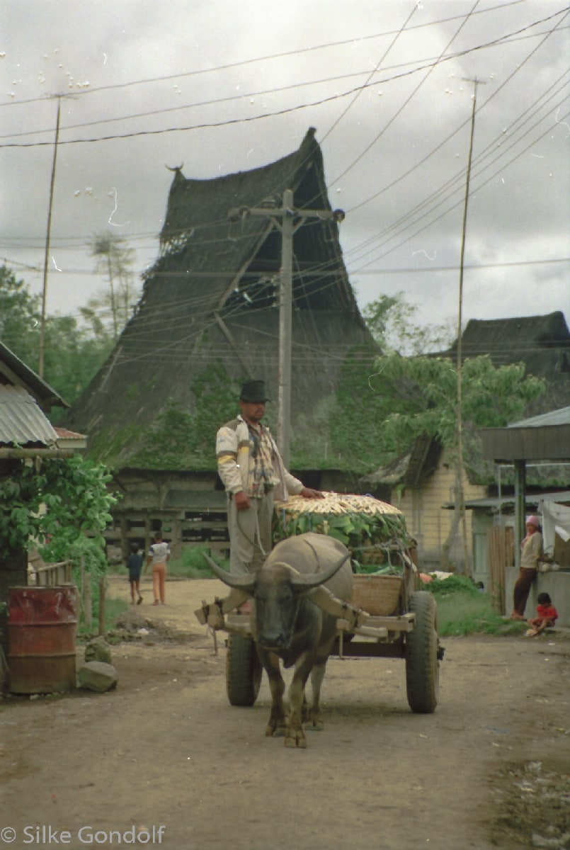 Batak houses are boat-shaped with intricately carved gables and upsweeping roof ridges. Karo Batak houses rise up in tiers. Each Batak group has its own rules and traditions. Toba Batak houses are laid out side by side with their front gables facing the street. It felt like entering an ancient untouched world. The street formed between the row of houses and the row of granaries is known as the alaman and is used as an area for work, drying of rice. Getting caught in bad weather on top of the Sinabung volcano was not a good idea. I went back in 1991.